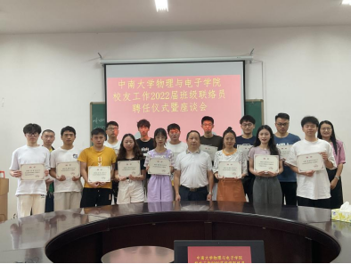 为进一步推进学院校友工作,与2022届校友建立更加紧密联系,2022年6月7日上午10:00,物理与电子学院校友工作2022届班级联络员聘任仪式暨座谈会在物理楼335会议室举行。物理与电子学院校友工作负责人李长庚副院长,校友工作联络员胡菁菁老师及2022届全体校友工作班级联络员参加了本次聘任仪式。本次会议由胡菁菁主持。