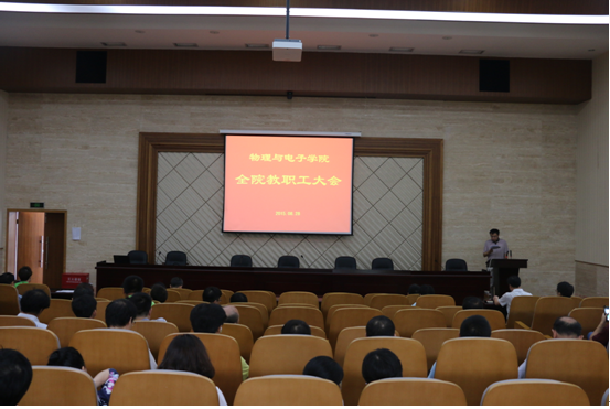 会议伊始,院长何军教授首先对退休调离老师和新进老师表示了感谢和欢迎,并对上一学年的工作进行了总结,通报了我院人才引进、招生就业等情况,分析了最新的物理学ESI发表及引用数据情况,希望全体教职工加倍努力,把工作做细做实。何军院长还传达了学校改革研讨大会的相关精神,强调与“三严三实”教育相结合,进一步深化学院改革、理顺各方关系、提升教学质量、加强创新驱动。他表示,学院将对学科进行全面评估,以制定十三五发展规划为契机,集思广益,协同创新,促进学院快速发展。