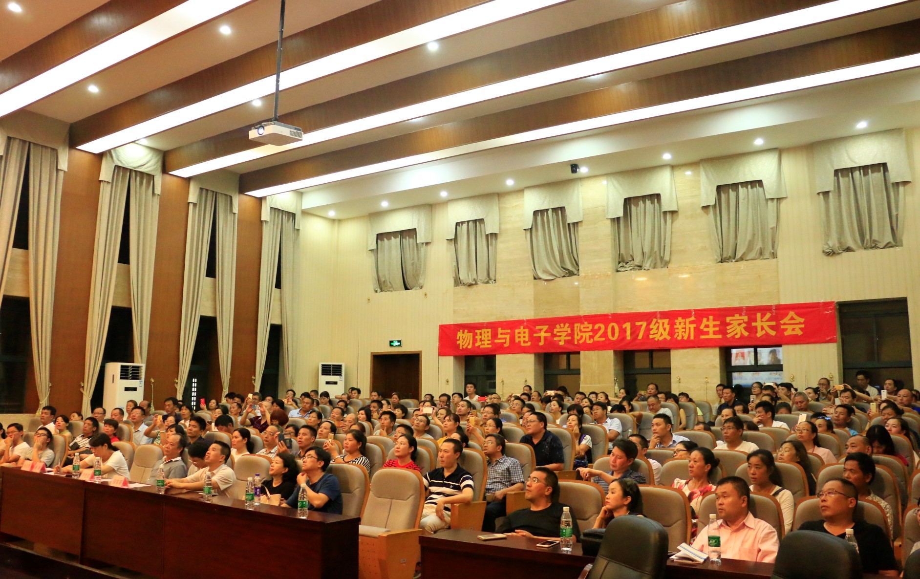 9月8日晚7:00,物理与电子学院2017级新生家长会在物理楼116报告厅顺利召开,院党委书记许宏武、党委副书记谢群、副院长孙克辉、徐富新等院领导,全体辅导员、新生班导师,以及200余名新生家长代表参加了本次会议。大会由学工办副主任钟旭东主持。