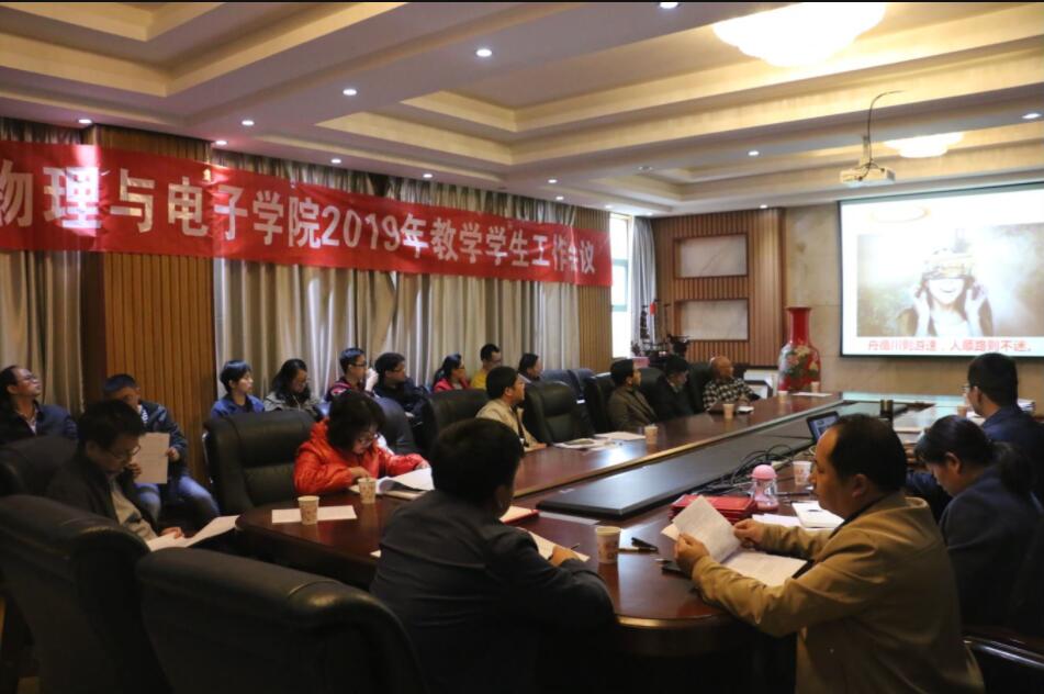 4月11日下午,物理与电子学院2019年度第一次教学学生工作会议在物理楼345会议室顺利召开。院领导、教学督导、教学专干、各系所中心主任及副主任、班导师、辅导员参加了本次会议。会议由辅导员杨凌云主持。