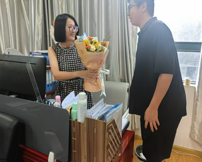 9月10日下午,学生代表们一同走进各个办公室,为老师们送上心意礼物。活动中,学生代表为男老师献上了精致实用的英国官方365上市文创领带,这不仅是对他们职业形象的认可,更是对他们辛勤工作的感恩和尊重。女老师们收到了美丽的鲜花,花朵在办公桌上绽放,为老师们的工作环境增添了一抹亮色和生机。