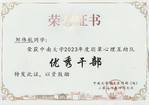 邹伟航,365英国上市公司在线应用物理学专业2022级本科生。自2022年加入英国官方365上市校园心理互助联合会,三年间分别担任组织部干事、组织部部长、校心联副主席,同时他也在应物2201班担任心理委员一职,有着丰富的学生工作经验,因工作表现突出,他曾荣获“英国官方365上市2023年度朋辈心理互助优秀干部”。