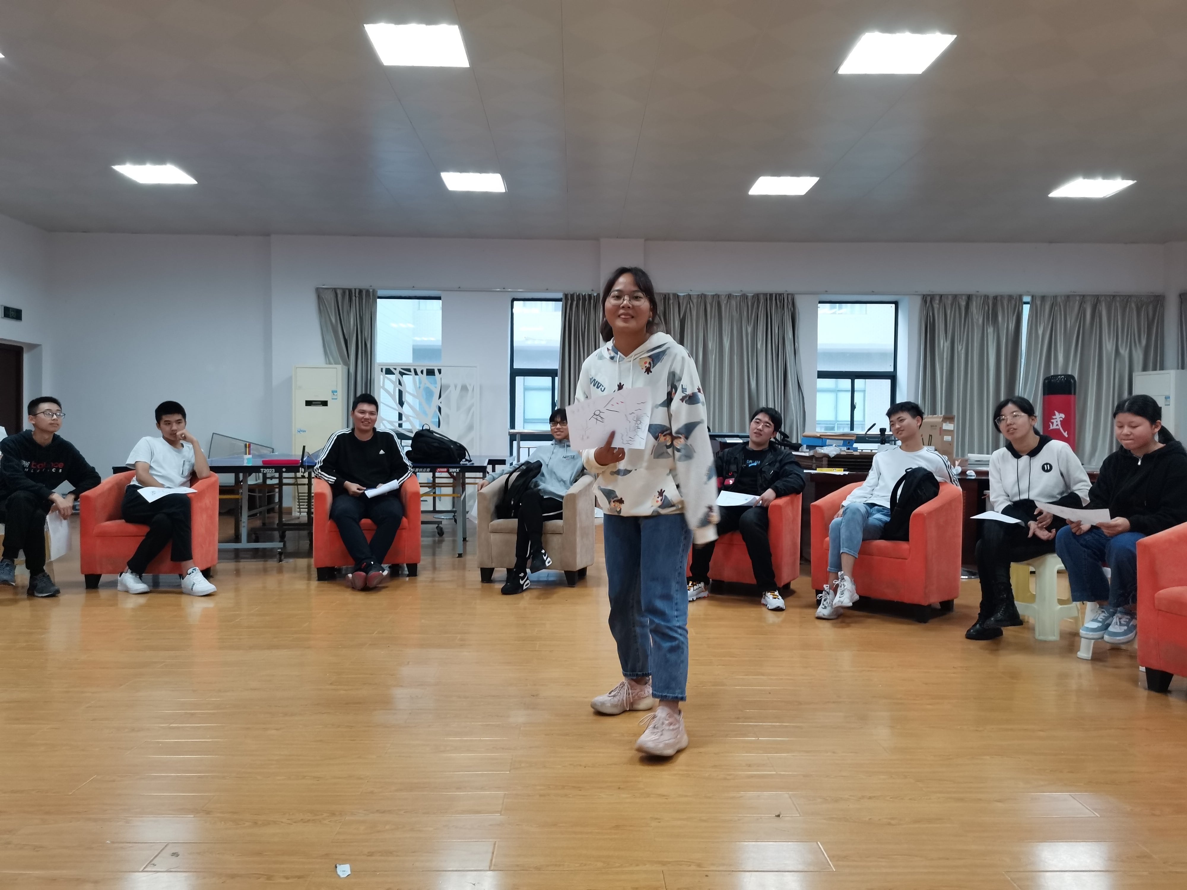 活动的开始之际,辅导员引领同学们做了一些热身活动,环绕一圈,在行进之中相互捶背,捏肩。最后每一位同学坐在后面一位的同学的大腿之上,旨在增加班级各位之间的信任。虽然开学已经一月有余,但同学之间或许还不太熟悉,经历热身之后,班级同学更加相信彼此。随后便开始了第一项活动,在同学之间随机抽签,组成五组,选出队长,队名,对歌,进行同学基础信息接龙的比赛。这促进了同学之间的认识,也许在开始之时,同学之间还不太认识,但经历了活动之后,相信新生们也认识了彼此。