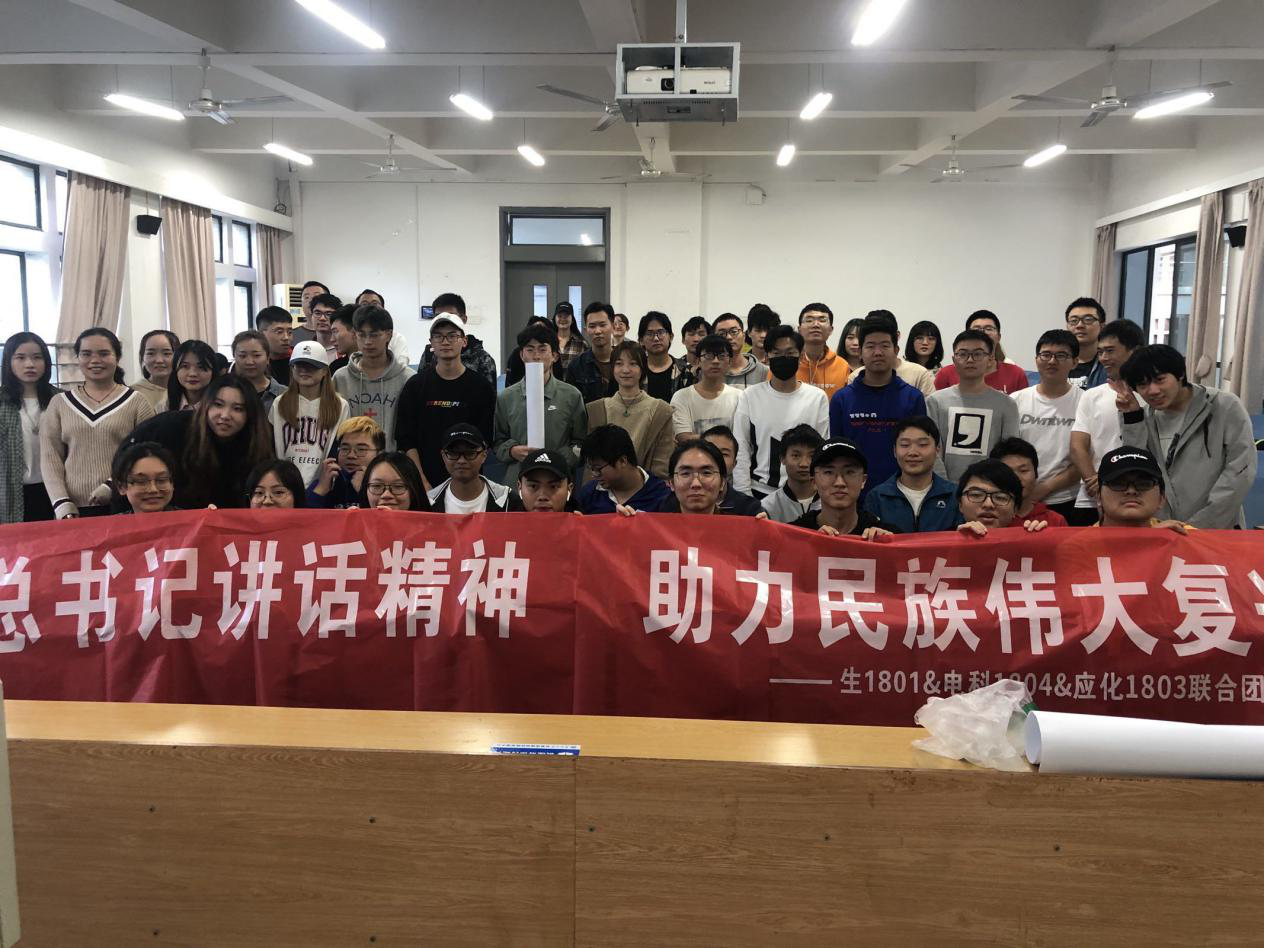 10月24日下午2点30分,以“学习习近平总书记讲话精神,助力民族伟大复兴”为主题的联合团日活动在新校B座214举行,活动由生工1801、电科1804和应化1803联合举办。此次团日活动由生工1801团支部艾昱婕主持,全体同学共同参加。