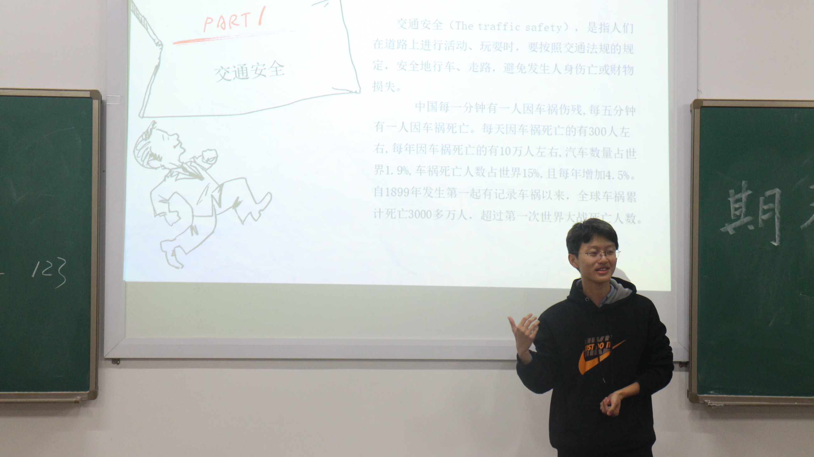 班会伊始,吴泰龙同学向同学们介绍了交通安全的注意事项,分析了交通事故的发生原因,结合我校放学时的路况向同学们提出了几点建议。而后进行了关于交通安全的知识竞赛,全体同学以寝室为单位分组,积极踊跃抢答问题。本次活动既调动了同学们参与的积极性,同时也向同学们普及了相关的交通安全知识,希望同学们遵守相关交通规定,注意自身安全。