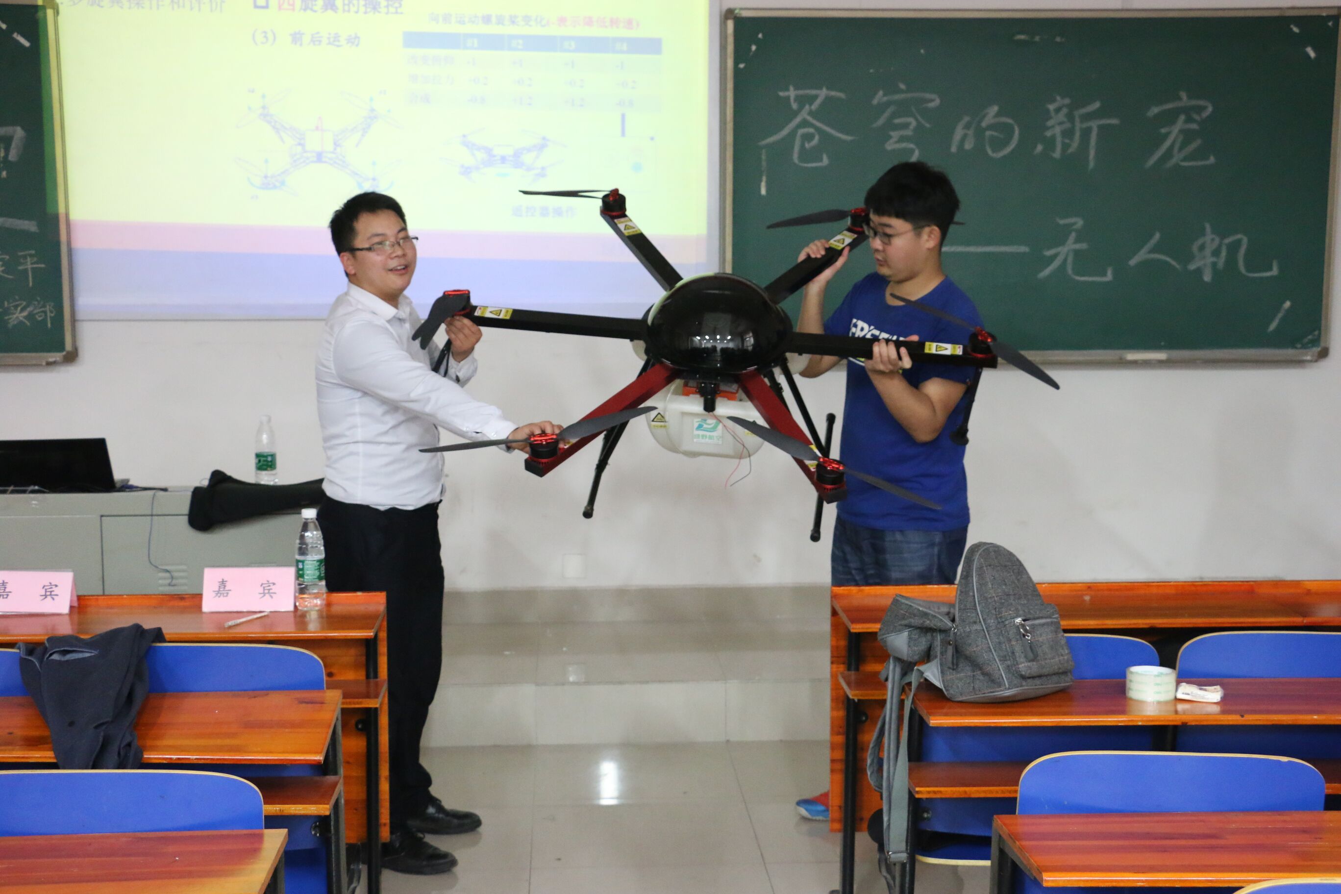 讲座伊始,主持人向同学们简单阐述了无人机的基本概念并提出了无人机系统技术先进、灵活机动、使用便捷、维护简单、性价比高、用途广泛等突出优势。继而科技讲堂便正式开始。陈定平由浅入深、旁征博引地向同学们介绍了无人机的结构组成、无人机的应用和无人机的安全注意事项。为了让同学们更深入的认识无人机,他还现场展示了他所参与创建的绿野航空公司最新研发的植保无人机,并结合多个视频实例向学生们直观真实地展示了无人机的技术与应用。讲座最后,学生们都积极参与现场互动,与嘉宾热烈探讨一些关于无人机的问题。