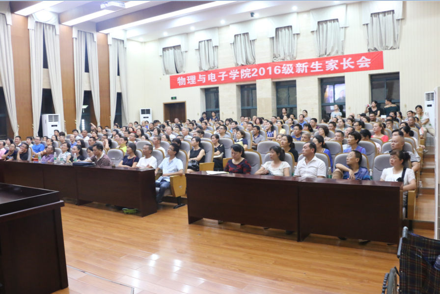 9月2日晚7:00,物理与电子学院2016级新生家长会于物理楼116报告厅顺利召开。院党委书记许宏武,副院长孙克辉、徐富新,党委副书记谢群出席家长会,200余名新生家长参加了此次会议。