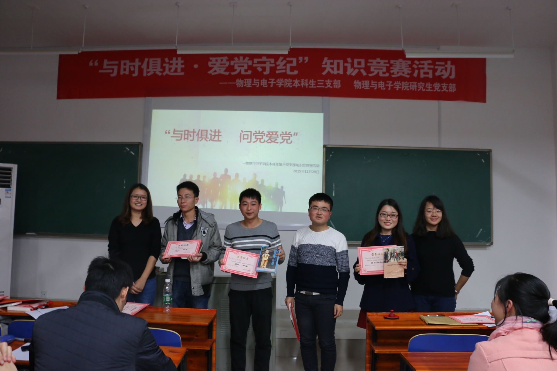 11月29日下午14时30分,物理与电子学院本科生三支部和研究生三支部联合举办的“与时俱进·爱党守纪”知识竞赛活动在物理楼124教室拉开帷幕。研究生党支部书记胡菁菁,本科生三支部书记邬永嘉和支部全体成员参与了此次活动。