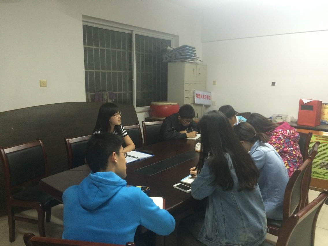 为搞好学风建设,弘扬正能量,4月16日晚9点,物理院于升华4栋二楼活动室召开了大一班长团支书会议。大一年级长张海霞、刘华渊以及各班班长、团支书共16人参加了此次会议。会议由张海霞主持。