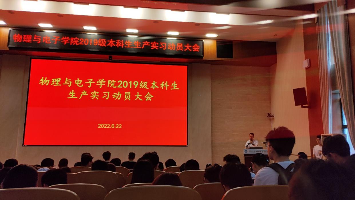 (通讯员 王心成)6月22日上午,为使学生明确生产实习的意义,引导学生做好实习工作,我院在物理楼116报告厅召开2019级生产实习动员大会。我院党委副书记谢群、副院长龙孟秋及所有带队老师出席,2019级全体本科生参加会议。本次会议由2019级辅导员郭学斌主持。