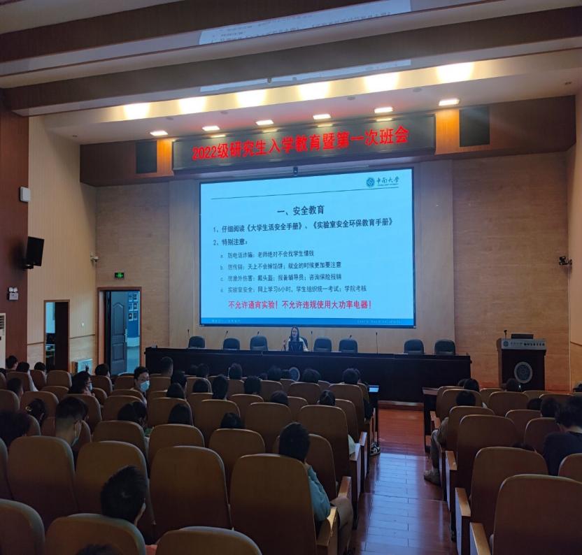 会上,胡菁菁老师对新任职各班班委委员进行介绍,要求同学们积极配合班委开展班级各项建设,以形成优良的班风学风,形成你追我赶的良好科研氛围。接着,胡老师就安全、诚信等主题开展新生入学教育,她特别强调了学生人生安全和防止电信诈骗安全,以及骑电动车务必戴好安全头盔等注意事项。胡老师对学生普遍关心的入党流程、社会实践和学术讲座考勤等进行了详细说明。最后,她希望2022级全体研究生要遵守规矩、尊重师友、孝顺父母、谈好恋爱,在研究生阶段都能够收获满满。在未来的学习工作中,2022级研究生新生将锐意进取,展现研究生良好的精神面貌,为学院的建设发展贡献青春力量!