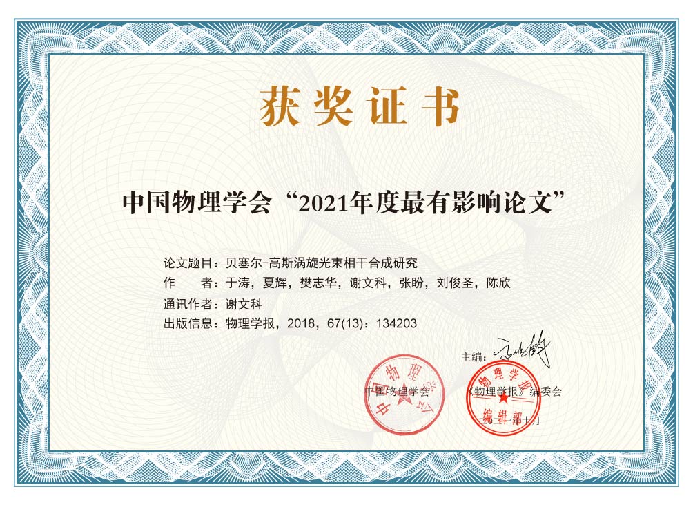 从中国物理学会2020/2021年秋季学术会议获悉,我院夏辉、谢文科等发表在《物理学报》的文章“贝塞尔-高斯涡旋光束相干合成研究”[第一作者:于涛,通信作者:谢文科。物理学报.2018,67(13):134203.doi:10.7498...